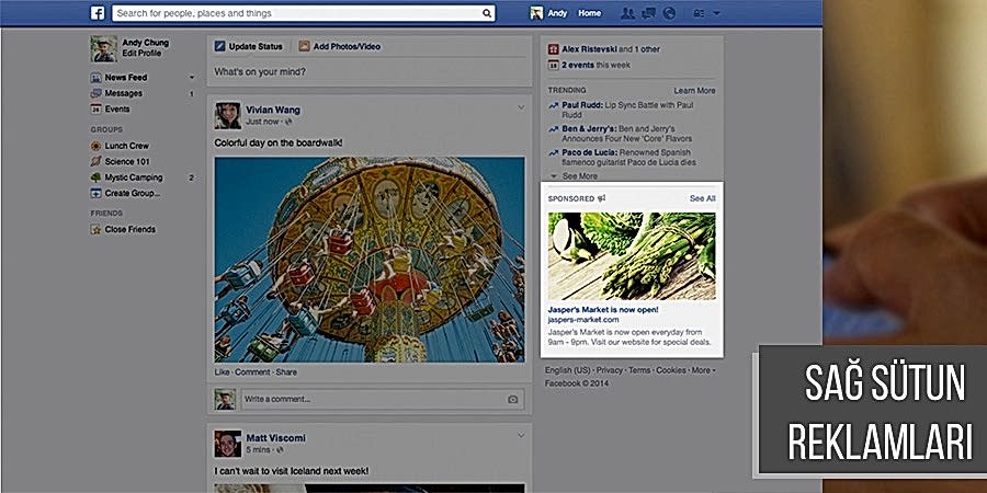 Facebook Sağ Sütun Reklamları, sitenin sağ kısmında yer alan reklam bölümünde çıkıyor. Reklam başlığı, gövde metni ve bir adet görsel ile kolayca organize edilebilecek Facebook sponsorlu reklam alanı için kritik nokta ise hedef kitle belirlenmesi. Yanlış bir kitle belirlenmesi, doğru organize edilmiş reklam planının çöpe gitmesine neden oluyor.